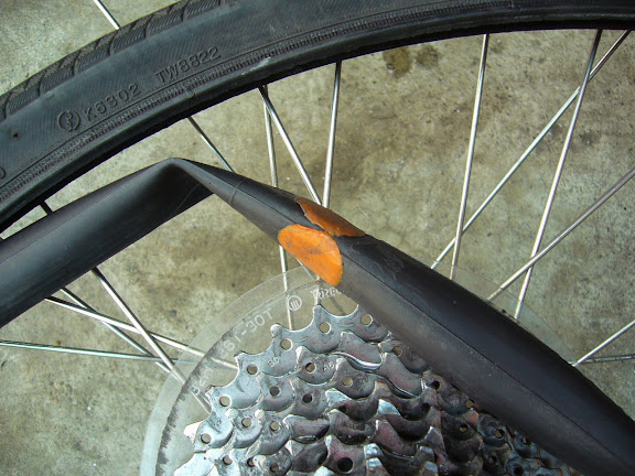 停下來一看!媽呀!!!!一根大鐵絲狠狠地就刺進了我的後輪,而且還是用立體大三折的方式。輪胎裡的氣瞬間跑得銷聲匿跡,倒是沒有出現"咻咻!"放煙火的聲音。