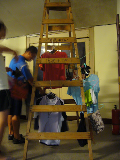 約是下午七點鐘,我們大家都洗淨了一身的疲憊,準備好好享受晚餐。外頭這時開始下起了毛毛雨。涼快嗎?涼快啊!可是,別忘了,我們剛洗好的衣物都晾在外頭,趕忙著,吃飯吃到一半,通通收了進來,晾在好笑的地方,請看底下照片。
